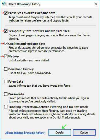 A new window will open up. Make sure all the items in that window are checked like in the image below (red arrows). Then click the Delete button (green arrow).