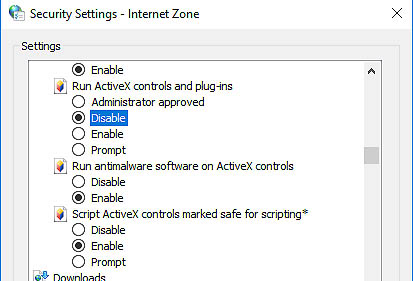 A box will pop up with option items. Scroll down through the list. You can disable ActiveX scripting, but this probably isn't the issue. Go ahead, disable it if you see it, as shown below.