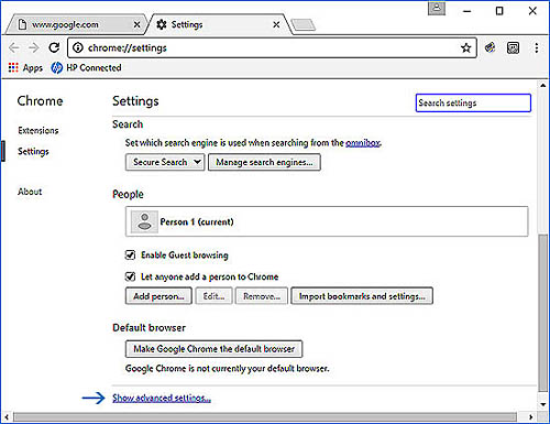 In the window that opens up, look for 'Show Advanced Settings' (blue arrow). Click that link.