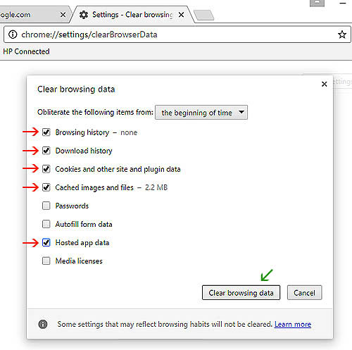 You will be presented with a pop up. Make sure all the items next to the red arrows in the image below are checked. Then click the 'Clear Browsing Data' button (green arrow).