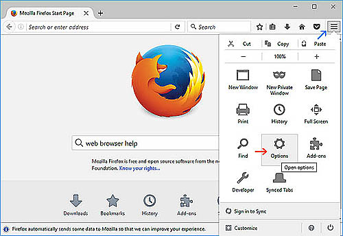 At upper right in the FireFox toolbar you will see a bar icon for settings. Click the bar icon (blue arrow). Then click 'Options' (red arrow).