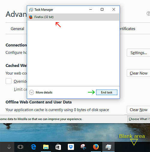 Select your web browser (green arrow), then click the 'End Task' button (blue arrow).