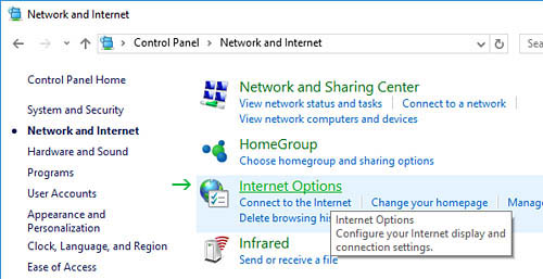 If you were using Internet Explorer or Edge, or are not sure what web browser you are using but you are on a windows system, open the control and head to 'Network and Internet'. If you are not using IE, skip the next few steps, look below for your web browser version, either Firefox or Chrome.