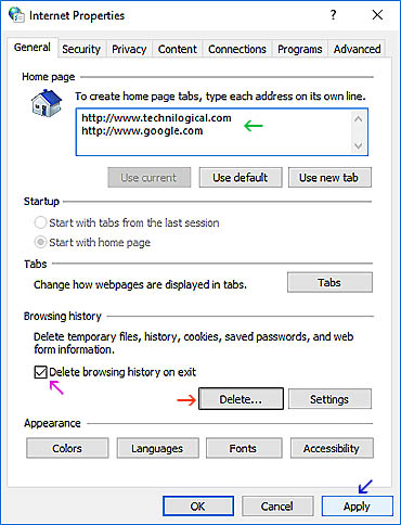 A new window will open up. In the General tab, check the little box that says 'Delete browsing history on exit' (purple arrow). If you want to add technilogical.com or google.com as homepage tabs, enter that information as shown also (green arrow). Then those pages will be the available tabs when you reopen your web browser, just in case the script added something to redirect your homepage. You can set it back to msn.com or anything else when we are finished.