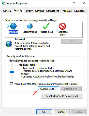 Select Internet zone at top (blue arrow). Then click the 'Custom level' button (red arrow).