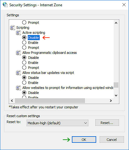 Disable Active scripting (red arrow), then click OK (green arrow).