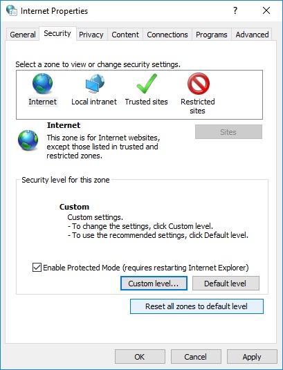 Back in the main internet options window, click on the Security tab. Then select the Internet zone at top (blue arrow) by clicking on it. Then click the 'Custom level' button.
