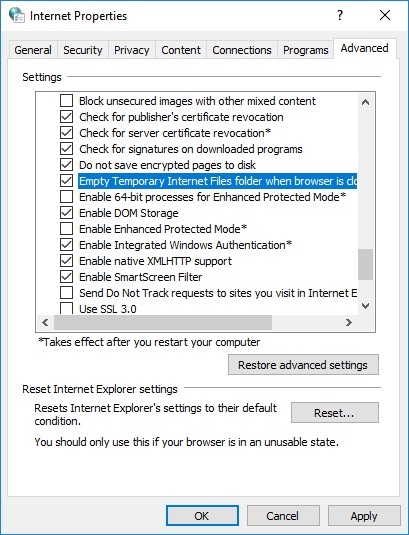 Back on the internet Properties window, click the 'Advanced' tab at right top. Scroll down until you see the option to 'Empty temporary Internet files folder when browser is closed'. Check the box for that item and the one directly above it that says 'Do not save encrypted pages to disk'. Click the 'Apply' button at bottom right, then click the 'OK' button.