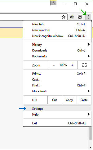 In Chrome, click the 3 vertical dots at top right (green arrow). That is your browser menu. In the drop down, click Settings (blue arrow)