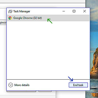 When Chrome is finished deleting the temporary internet files, right click on the taskbar, open Task Manager. Locate Chrome in your list of running applications, and then click 'End Task'.