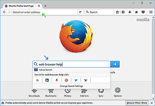 In the example below, using FireFox, the green arrow indicates the address bar. The blue arrow indicates the search bar. This is the FireFox homepage. If you use Google as a homepage then you will see the main google search page. The address bar is always in the same place on your web browser. Search bars at websites sometimes vary.