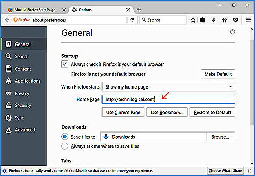 On the General tab, make sure your homepage resolves to a known good address you are familiar with (red arrow).