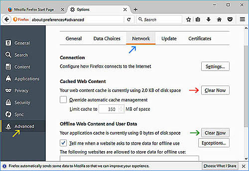 Click 'Advanced' at right (yellow arrow) and then click the 'Network' tab at top (blue arrow). Then click both 'Clear now' buttons on the right of the same page (red arrow, green arrow).