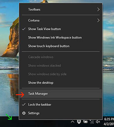 Right click on any blank area of the task bar (green arrow), you get a pop-up. Select Task Manager (red arrow).